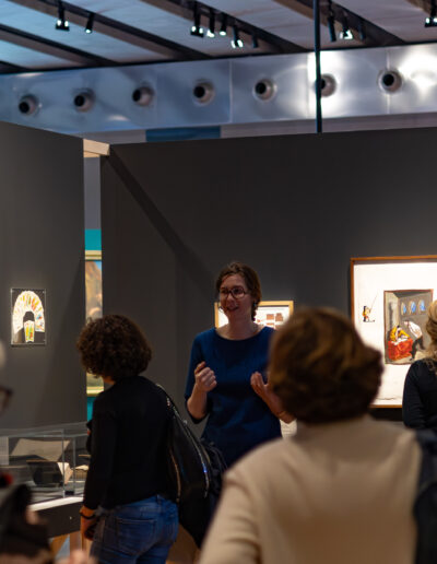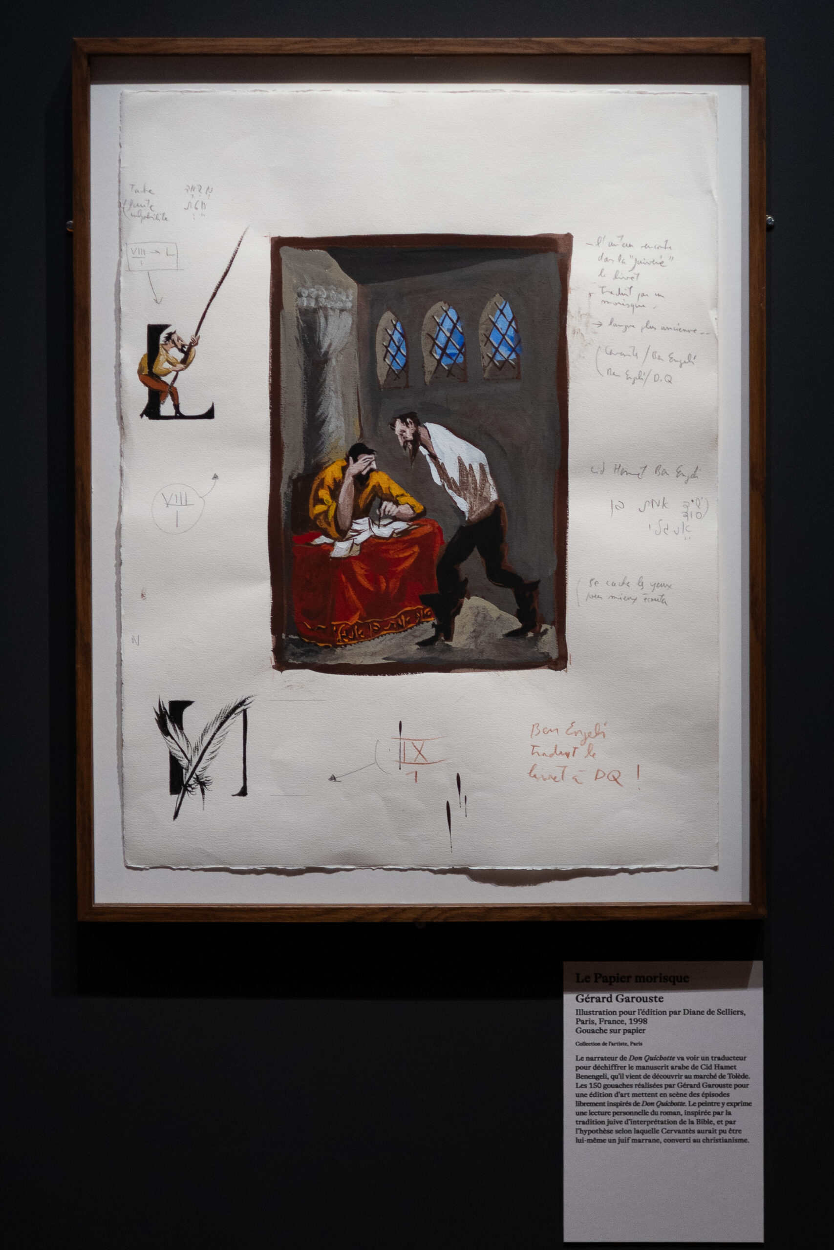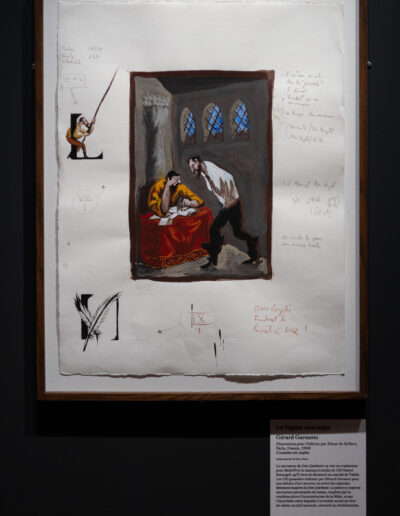 Au fil de l’exposition, nous avons en effet pu mesurer à quel point cette figure a inspiré les grands artistes, de Honoré Daumier à Pablo Picasso, en passant par Salvador Dalí ou encore Gustave Doré. Notre attention a été particulièrement retenue par les gouaches de Gérard Garouste qui, en 1998, réalise les illustrations pour le Don Quichotte des Éditions Diane de Selliers. De cette collaboration est née une œuvre d’une grande puissance imaginative, mêlant humour et érudition, véritable exégèse du roman.